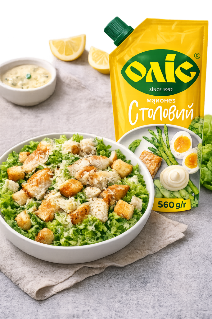 Соус. Змішай майонез Оліс “Столовий”, лимонний сік, подрібнений часник, сіль та перець.